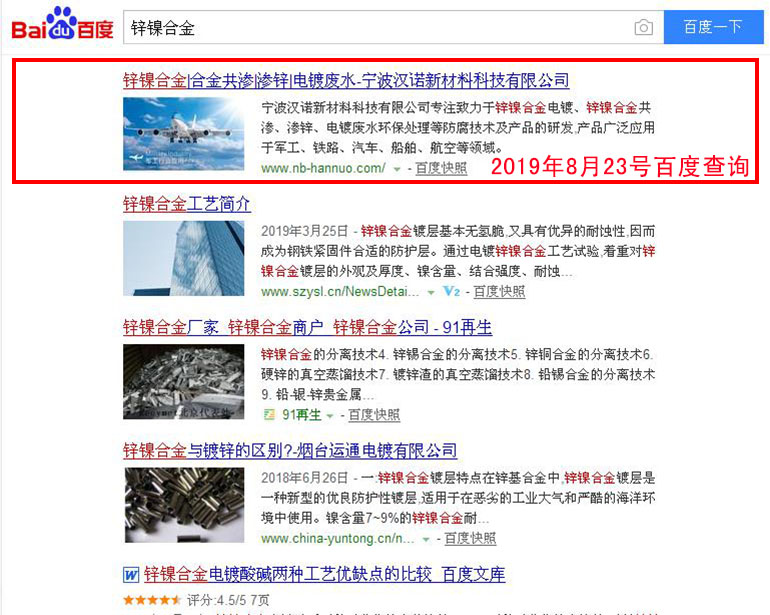 鋅鎳合金 百度(PC)自然排名第1名,360搜索、搜狗、手機搜索等均也有比較好的排名...